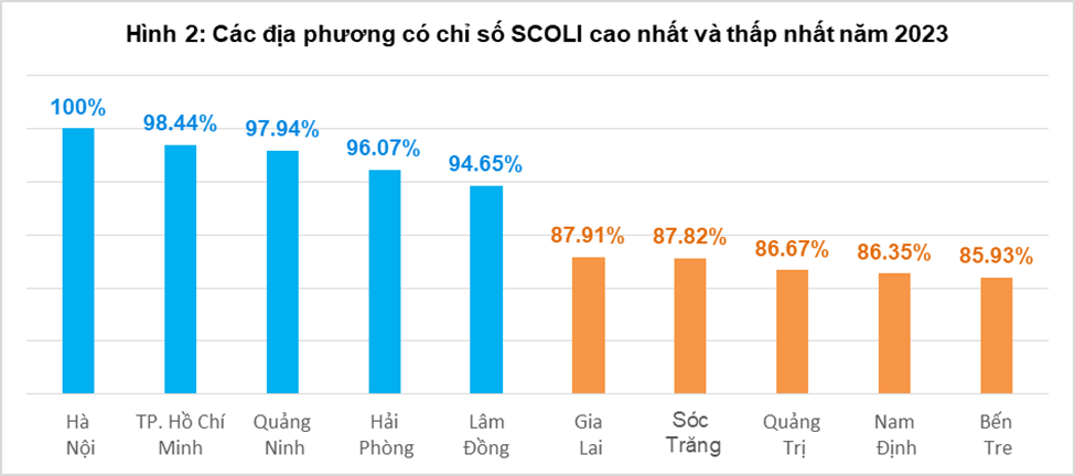 Chỉ số SCOLI năm 2023 được biên soạn cho 6 vùng kinh tế – xã hội, trong đó so sánh giá của 5 vùng với vùng Đồng bằng sông Hồng và biên soạn cho 63 tỉnh, thành phố trực thuộc Trung ương, so sánh giá của 62 địa phương với Hà Nội. Kết quả biên soạn chỉ số SCOLI năm 2023 cho thấy, vùng Đồng bằng sông Hồng có chỉ số SCOLI cao nhất, vùng Đồng bằng sông Cửu Long có chỉ số SCOLI thấp nhất. Năm địa phương có mức giá cao nhất cả nước trong năm 2023 là Hà Nội, thành phố Hồ Chí Minh, Quảng Ninh, Hải Phòng và Bình Dương; Năm địa phương có mức giá thấp nhất cả nước là Bến Tre, Nam Định, Quảng Trị, Sóc Trăng và Gia Lai.