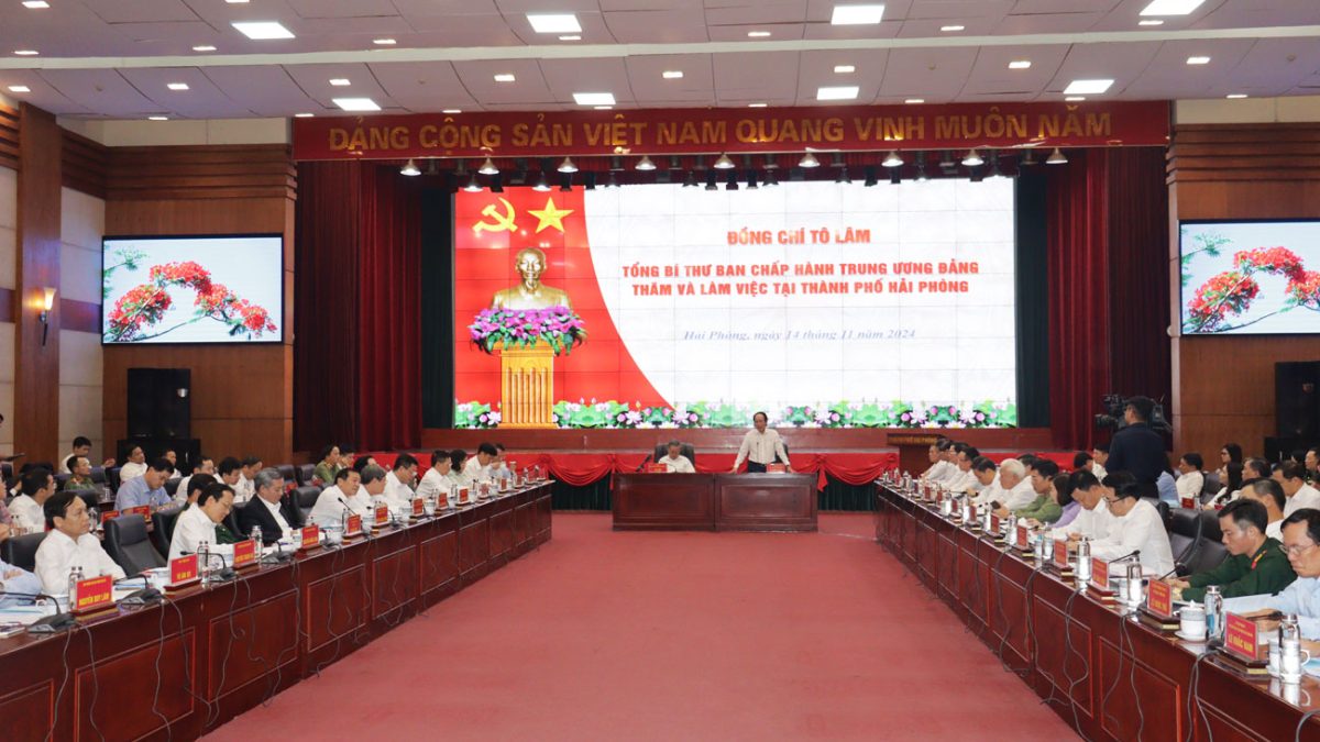 (Haiphong.gov.vn) – Chiều 14/11, đồng chí Tô Lâm, Tổng Bí thư Ban Chấp hành Trung ương Đảng cộng sản Việt Nam làm việc với Ban Chấp hành Đảng bộ thành phố về kết quả thực hiện Nghị quyết Đại hội lần thứ XIII của Đảng, Nghị quyết Đại hội XVI Đảng bộ thành phố; quán triệt, triển khai thực hiện Chỉ thị số 35-CT/TW của Bộ Chính trị và tình hình triển khai thực hiện Kết luận số 96-KL/TW của Bộ Chính trị về tiếp tục thực hiện Nghị quyết số 45-NQ/TW.