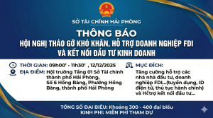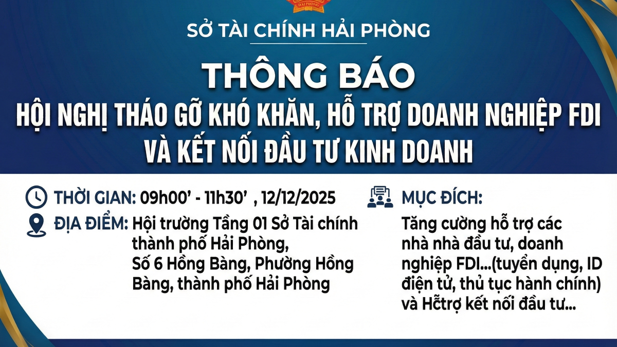 Sở Tài chính Hải Phòng trân trọng thông báo tới quý nhà đầu tư/doanh nghiệp về việc tổ chức Hội nghị tháo gỡ khó khăn, hỗ trợ doanh nghiệp FDI trong quá trình hoạt động sản xuất và kết nối đầu tư năm 2025. Chương trình hội nghị cụ thể như sau: